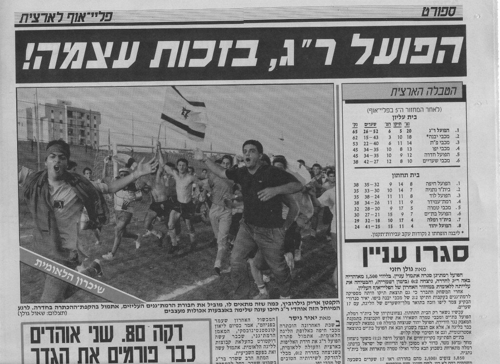 הרכב הפועל ר"ג מול יפו: שמעון מועלם, יובל בקר, מאיר סומך, פרנטישק צ'יקה, רונן סורני, אבי ברשצקי (אלון בוקסנבוים), אייל כהן, שמעון פרץ, תומר ברזילי, (ג'קי דוז), רונן צפריר, אילן בכר. מאמן: אבי בוקסנבאום, 1500 צופים במכתש.