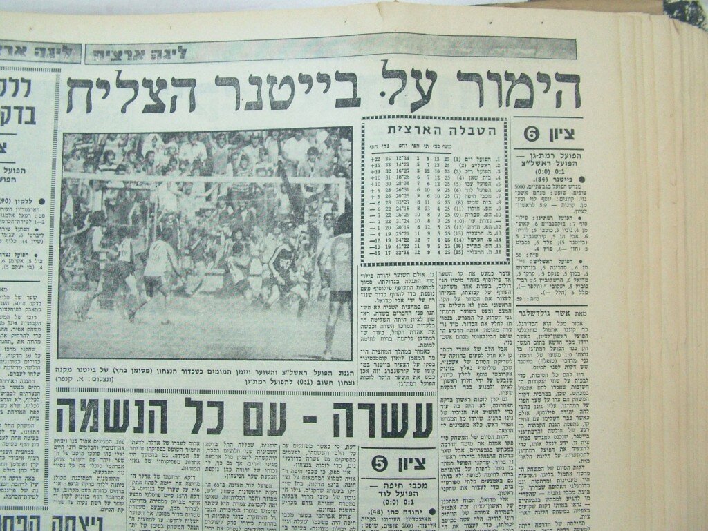 בדקה ה – 85 הרימו קרן ואת הכדור שהגיע אלי בעטתי מעשרה מטרים אל הפינה הימנית של שער ראשל"צ עליו הגן אפריים ויימן". לאחר הילולת הניצחון הזה, נראתה הליגה הלאומית בטווח של נגיעה.
