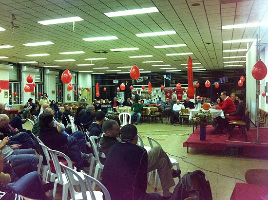 בכניסה לאולם אני משלם חמישים ש"ח ומקבל בתמורה סרט אדום שמודבק על ידי ותולש לי אח"כ כמות מכובדת של שערות. בפנים האולם מקושט והשולחן ערוך. אני מופתע לטובה מכמות האנשים ומזהה קבוצות קבוצות של אוהדים מוכרים ולידם מסתובבים אנשים גבוהים שבימי המקרא כונו"נפילים", שכדי להסתכל להם בעיניים אתה צריך למתוח חזק את הצוואר ולהסתכן בנקע.
